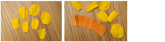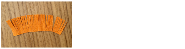 4. Leikkaa kreppipaperista kukan heteiksi kaavan mukainen kapea, pitkä suikale. Hapsuta suikale saksilla kuvan mukaisesti. Varo, ettet katkaise suikaletta kokonaan.