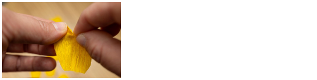 2. Terälehtiä voi muotoilla leikkaamisen jälkeen. Venytä terälehtien yläreunaa poimuille ja paina terälehtien keskeltä peukalolla. Näin kreppipaperi venyy pyöreämmäksi. Varo, ettei lehti repeä.