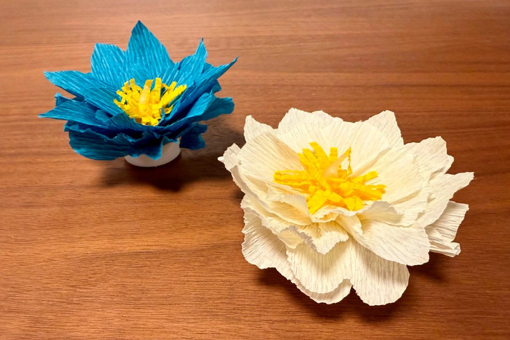Sinisestä ja valkoisesta kreppipaperista syntyy kaunis itsenäisyyspäivän kukkakoriste led-tuikkuun. Voit myös valita kukkaan lempivärisi.