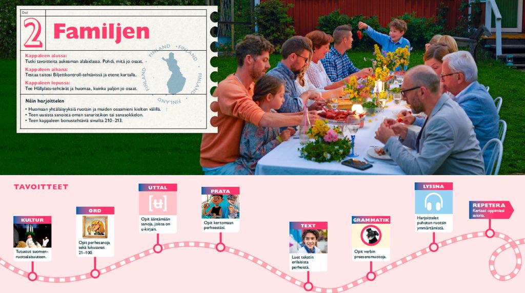 Tutki Biljett 1 -oppimateriaalin Del 2 -näytesivuja. Jaksossa harjoitellaan kulttuuritietämystä, sanastoa, ääntämistä, arkifraaseja, tekstin ymmärtämistä, kielitietoa ja kuuntelua.