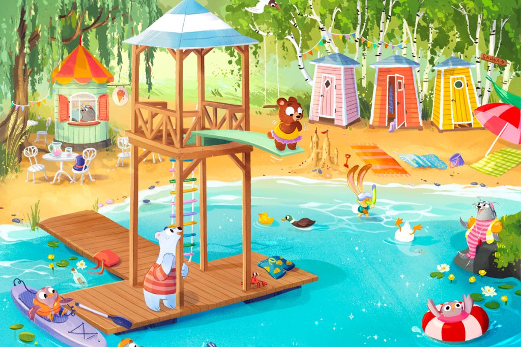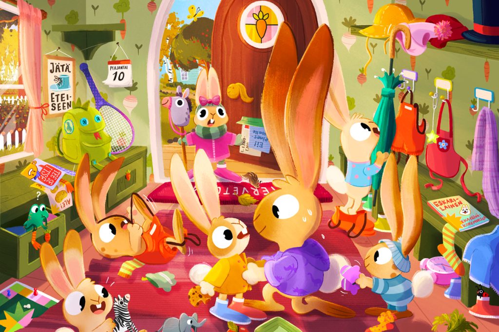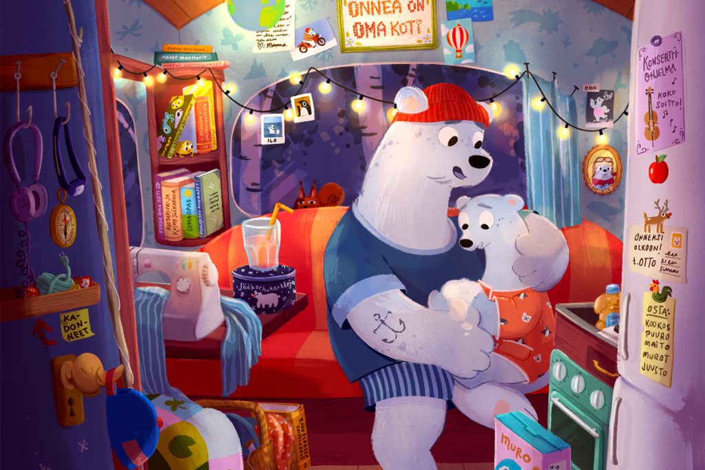 – Käytän paljon värejä, mutta kuvitukseni ei kuitenkaan ole räikeää. Kuvissani on tunnelmaa, joka tukee tarinaa ja houkuttelee lasta astumaan kuvan sisään.