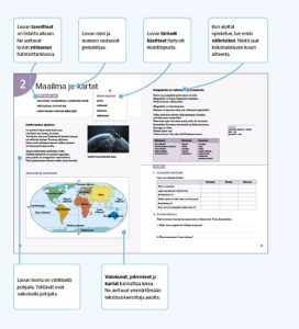 Painettujen tekstikirjojen nimet ovat suoraan opetussuunnitelmasta. Elämän edellytykset -kirjassa tarkastellaan maapallon ilmiöitä alueellisten esimerkkien avulla. Muuttuvat maisemat ja elinympäristöt -kirjassa tutkitaan Suomen ja maapallon eri alueiden luonnon- ja kulttuurimaisemia. Ihmiset ja kulttuurit -kirjassa perehdytään väestöön, muuttoliikkeisiin, kulttuureihin, ihmisoikeuksiin ja elinkeinoihin.